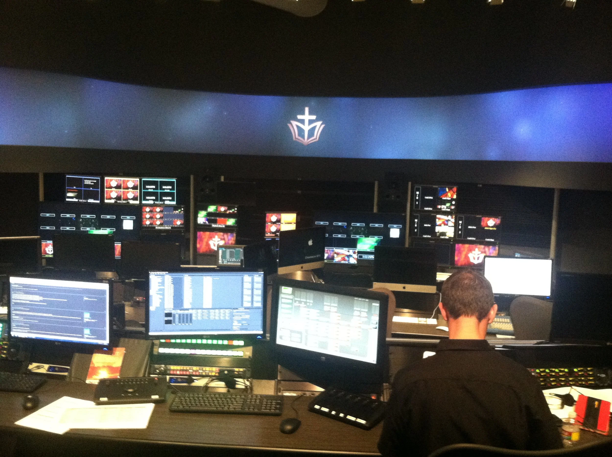Part of a $125 million new build, the First Baptist Dallas sanctuary called for seven 22k rear projectors on a compound-curved 150' wide screen. I blended the screen with Pandoras Box Broadcast Servers. The more interesting engineering was in the control room, where everything on the sanctuary screen is shown in duplicate on a working quarter-scale projection system with identical contours. I built controls in Widget Designer to operate both systems in parallel so the video operators have an accurate heads up. Also the staff can test content and work with templates with the sanctuary system powered down.